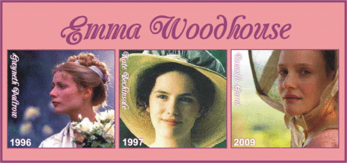 Estas três actrizes deram vida e alma à Emma. A minha preferida - e sei que poucas concordarão comigo - é Gwyneth Paltrow simplesmente porque corresponde à imagem que faço de Emma. A que menos gosto é Kate Beckinsale porque a acho demasiado séria. Já Romola, apesar de ser uma boa actriz, não me convence totalmente.