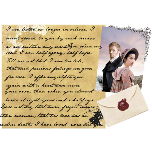 "I can listen no longer in silence. I must speak to you by such means as are within my reach. You pierce my soul. I am half agony, half hope. Tell me not that I am too late, that such precious feelings are gone for ever. I offer myself to you again with a heart even more your own than when you almost broke it, eight years and a half...ago. Dare not say that man forgets sooner than woman, that his love has an earlier death. I have loved none but you. Unjust I may have been, weak and resentful I have been, but never inconstant. You alone have brought me to Bath. For you alone, I think and plan. Have you not seen this? Can you fail to have understood my wishes? I had not waited even these ten days, could I have read your feelings, as I think you must have penetrated mine. I can hardly write. I am every instant hearing something which overpowers me. You sink your voice, but I can distinguish the tones of that voice when they would be lost on others. Too good, too excellent creature! You do us justice, indeed. You do believe that there is true attachment and constancy among men. Believe it to be most fervent, most undeviating, in