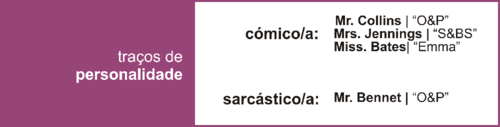 Adoro, simplesmente adoro as respostas que Mr. Bennet dirige à esposa. Revela um senso de humor extraordinário. Ele é o meu personagem sarcástico preferido. Quanto à categoria "cómico/a" repito mais uma vez Mr. Collins e Mrs. Jennings, acrescento Miss Bates, simplesmente porque me fazem rir.