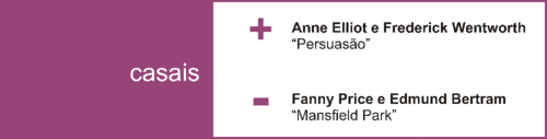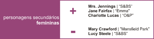 Mais uma vez, Mrs. Jennings... Eu realmente gosto bastante dela. Sei que muitos de vocês estão a ler isto pensarão nela como uma figura ridícula e inconveniente. Eu acho-a doce e adorável. Perdoo-lhe a coscuvilhice porque ela o faz sem maldade. Também gosto bastante de Jane Fairfax, acho que ela daria um livro à parte. E finalmente Charlotte Lucas: objectiva, frontal e racional. Do lado oposto, das figuras femininas secundárias que eu menos gosto, tenho de destacar as manipuladoras Mary Crawford e Lucy Steele.