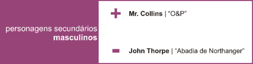 Mr. Collins se soubesse que é tão amado por estas paragens... Sim, Mr. Collins é famoso neste blogue porque talvez quase todas nós gostamos dele. Confesso que ele diverte-me. Confesso que dou grandes gargalhadas com suas frases empoladas. Já John Thorpe cria em mim uma enorme vontade de apertar-lhe o pescocinho de tão mau carácter que ele é... Ainda por cima, um mau carácter com pouco estilo e inteligência.