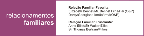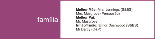 Os relacionamentos familiares são o combustível da obra de Jane Austen. Pais, filhos, irmãos, primos, tios, marido e mulher. Tudo gira à volta da dinâmica entre estes elementos. Sempre com uma história de amor pelo meio. Quando eu penso em figura materna surge-me no pensamento a figura de Mrs. Jennings e Mrs. Musgrove, ambas dedicam-se ao bem-estar e dão carinho aos seus filhos. Melhor pai, devo dizer, que foge-me o pensamento para um personagem secundário: Mr. Musgrove. Acho que os pais das figuras centrais não são o melhor exemplo...