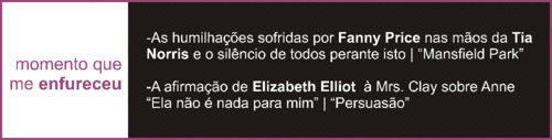 Todas as heroínas de Jane Austen têm qualidades e defeitos fascinantes. Se pensarmos bem, podemos encontrar um pouco delas dentro de nós. Eu tenho um grande carinho por Anne Elliot (Persuasão) e por Elinor Dashwood (S&BS), ambas por motivos diferentes. Anne, pela sua capacidade de abnegação e de sofrimento. Tudo ela suporta em silêncio. Elinor pela sua dedicação à família e pela sua força de carácter. Ela coloca todas as pessoas antes até do seu próprio bem-estar. É altruísta. É também uma mulher forte, racional e dedicada. Ambas são as minhas preferidas. Não posso escolher somente uma.