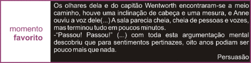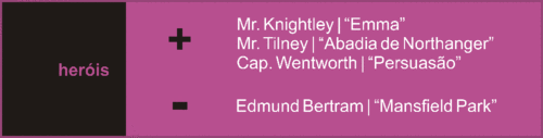 Há algumas categorias na selecção deste top que são extremamente difíceis… Para mim, é extremamente difícil eleger o meu herói preferido. Convenhamos, Jane Austen desenhou homens maravilhosos… Passei várias dias a pensar… e cheguei a uma conclusão: três nomes não me saem da mente. Portanto, perdoem-me não optar somente por um. Mr. Knightley, Mr. Tilney e Capitão Wentworth. Por esta ordem. Explico: provavelmente, para quem lê toda a obra de Jane Austen, Mr. Knightley não seja o mais apelativo. Ele não faz grandes gestos, não é uma pessoa que chame a atenção. Mas ele tem os requisitos que despertam em mim uma grande admiração: frontalidade, verdade, correcção, lealdade, discrição, humor. Para além de, claro, ser um verdadeiro cavalheiro. Mr. Tilney é um forte candidato a ser, no futuro, um Mr. Knightley. Ele também frontal, verdadeiro, correcto, leal e tem um enorme senso de humor. Adoro a forma como ele, no fundo, enfrentou o pai para ir ao encontro de Catherine Morland após ela ter sido expulsa da Abadia. Acto digno - também - de um verdadeiro cavalheiro. Eu só coloco o Capitão Wentworth em terceiro lugar porque ele foi um pouco cruel com Anne ao andar a namoriscar as irmãs Musgrove. É certo que ele tinha o orgulho ferido mas foi Anne quem teve de sofrer a perda do amor e, ao mesmo tempo, permanecer a viver naquela casa e família em que não era compreendida; enquanto ele andou a percorrer o mundo. Contudo, apesar disto, é um homem admirável. Um homem capaz de ser fiel a um sentimento tantos anos sem ter a esperança de voltar a reciprocidade do mesmo é algo incomum. Assim como é incomum um homem capaz de escrever uma carta como a que ele escreveu…
