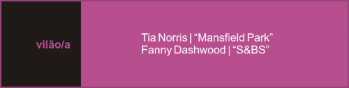 Mas, nesta categoria, eu tenho que eleger dois nomes: Tia Norris | “Mansfield Park” e Fanny Dashwood | “S&BS”. Dentre todos os vilãos e vilãs de Jane Austen, estas duas mulheres são o ápice da vileza e quase pelos mesmos motivos: os seus gestos são movidos por pura vontade de humilhar, em pisar os sentimentos e a dignidade daquele/a que for mais desfavorecido/a. A Tia Norris não teve qualquer pudor em humilhar publicamente Fanny Price desde que ela chegou em Mansfield Park ainda criança. E tudo fez, ao longo da obra, para depreciar e para prejudicar o bem-estar da sobrinha. Até algo tão simples quanto aquecimento no quarto ela privou Fanny de usufruir. Fanny Dashwood também nunca perdeu a oportunidade de criticar e humilhar as irmãs Dashwood e Mrs. Dashwood. Manipulou o marido para este não ajudar financeiramente as irmãs e a madrasta, contribuiu para a separação precoce de Elinor e Edward e sempre procurou o afastamento do convívio delas com o seu marido (e irmão das Dashwood). Penso que se fosse do alcance dela, teria prejudicado ainda mais as Dashwood.