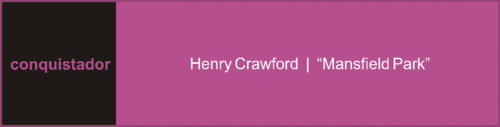 Para mim, Henry Crawford, de Mansfield Park, será sempre o grande conquistador dentro da obra completa de Jane Austen. Ele não conquistava unicamente as mulheres com as suas atenções e charme mas também ganhava a simpatia e amizade de todos os homens da obra. A única conquista que não conseguiu concretizar totalmente foi a de Fanny Price. Ela também é a única que o fez ponderar desistir desta sua vocação epicurista.