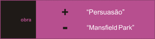 No que diz respeito a obra menos favorita… confesso, este foi um exercício inglório. Haverá algum livro de Jane Austen de que eu não goste? Não, não há. Eu gosto de todos por diferentes razões. Então, deve ficar assente: não há nenhuma obra de Jane Austen de que eu não goste. Então, tive de fazer o exercício de outra forma. Comecei a pensar qual obra teria algum aspecto que não tivesse me satisfeito por completo. Então, cheguei a conclusão que fiquei bastante penalizada por Fanny Price, em “Mansfield Park”, ter repelido Mr. Henry Crawford e de ter acabado por casar com Edmund Bertram. Eu chego a ser chata com isto, mas eu só consigo pensar “Como assim, Fanny, vais contentar-te em ser a solução sobressalente?”. Realmente, não consigo me conformar com um livro tão admiravelmente escrito com personagens tão interessantes e tão profundo ter um final tão óbvio. Acho que esta é a única mágoa que guardo na obra de Jane Austen.
