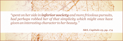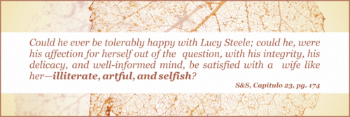 S&BS| "Poderia ser razoavelmente feliz com Lucy Steele; poderia, pondo de parte a sua afeição por ela, com toda a sua integridade, delicadeza e cultura, satisfazer-se com uma mulher como ela… inculta, falsa e egoísta?" Pg. 104