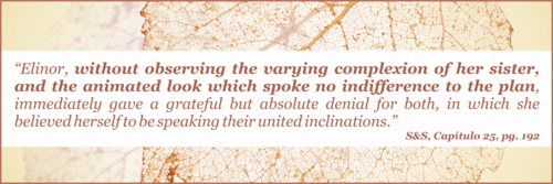 S&BS| "Elinor, sem reparar nos diversos tons que coloriam a cara de sua irmã e no ar animado que demonstrava interesse pelo plano, emitiu imediatamente uma grata mas absoluta recusa em nome das duas, acreditando estar a exprimir a vontade de ambas" Pg. 113
