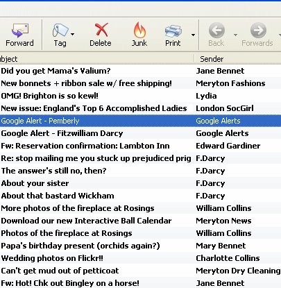 A caixa de emails de Elizabeth Bennet. Adoro as mensagens do Mr Collins e de Mr Darcy (The answer still no, then?).