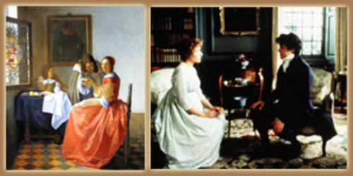 Anteriormente eu partilhei a sensação que eu sempre tive de que assistir a este filme era muitas vezes como olhar para uma série de pinturas. Exemplifiquei esta minha sensação referindo aquela cena em que Coronel Brandon (Alan Rickman) vê Marianne (Kate Winslet) pela primeira vez quando ela está a tocar piano. Nesta cena, ela termina inclinando a cabeça para o lado. Neste específico momento, nestes breves segundos, parece que visualizamos um quadro. São inúmeras as cenas em que isto acontece, esta sensação. Há pouco tempo descobri, ao ler no site Eras of Elegance, que Ang Lee teria se inspirado na obra do pintor holandês Johannes Vermeer. Então, tudo fez sentido para mim. O jogo entre luz e sombra é bastante acentuado em várias cenas.
