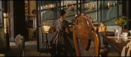 O Colonel Fitzwilliam não me convenceu nada, não gostei. Há duas cenas que achei engrassadísimas, são acrescentos desta versão, não fazem parte da obra: uma cena em que Mr. Collins coloca um chapéu ridículo que é anti-afogamento, oferecido por Lady Catherine; e outra onde aparece um cão adorável que é de Mr. Darcy - já na versão de 1995 aparecei um cão, mas este é mais adorável.